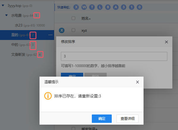 用户点修改数字,数字越小排越前面,不能重复。公司通信录按照排序显示。